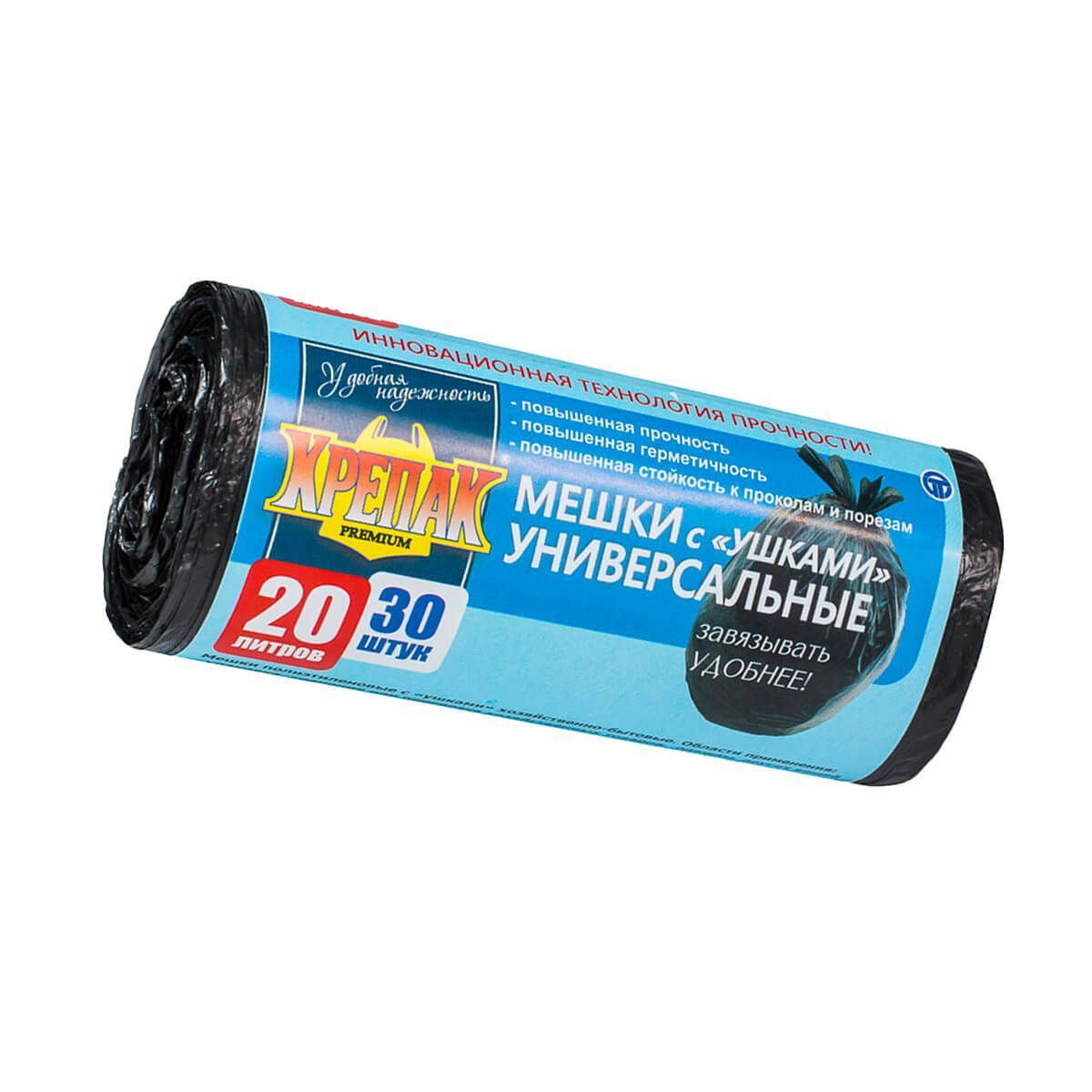 Мешки для мусора 20 л, с ушками, черные, в рулоне 30 шт., ПНД, 10 мкм, 550х440 мм, Крепак, 4607075710443